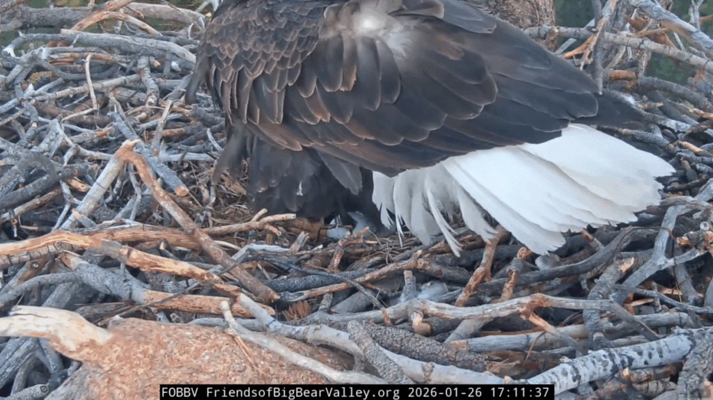Jackie lays her first egg of the season on January 23rd, 4:32pm pst. Shadow arrived to see the egg, the incubation has begun.