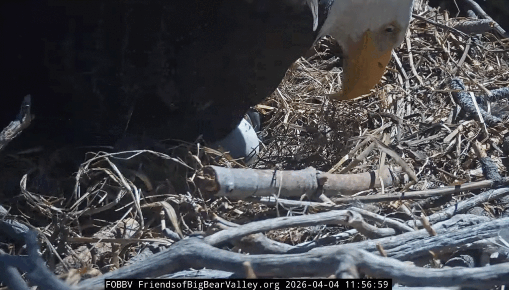 4/3/26 – We have a pip! You can see the eaglet pushing the broken egg shell up this morning at 10:03am as the cam operator zoomed in. Congratulations Jackie & Shadow!!!
