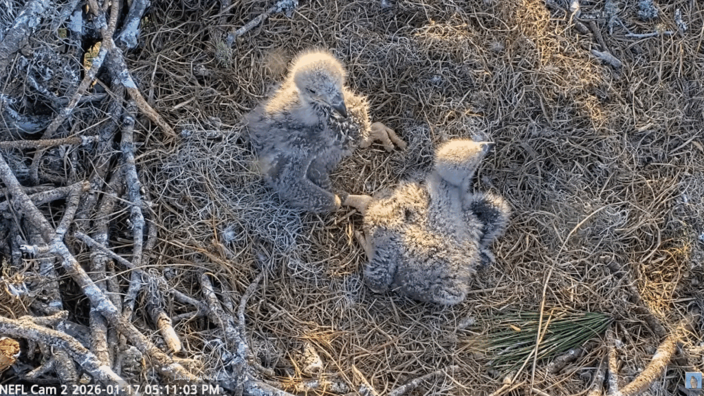 1/17/26 – Gabby feeds NE32 and NE33, both were fed very well. These two cute eaglets are growing up nicely, with crops always full.