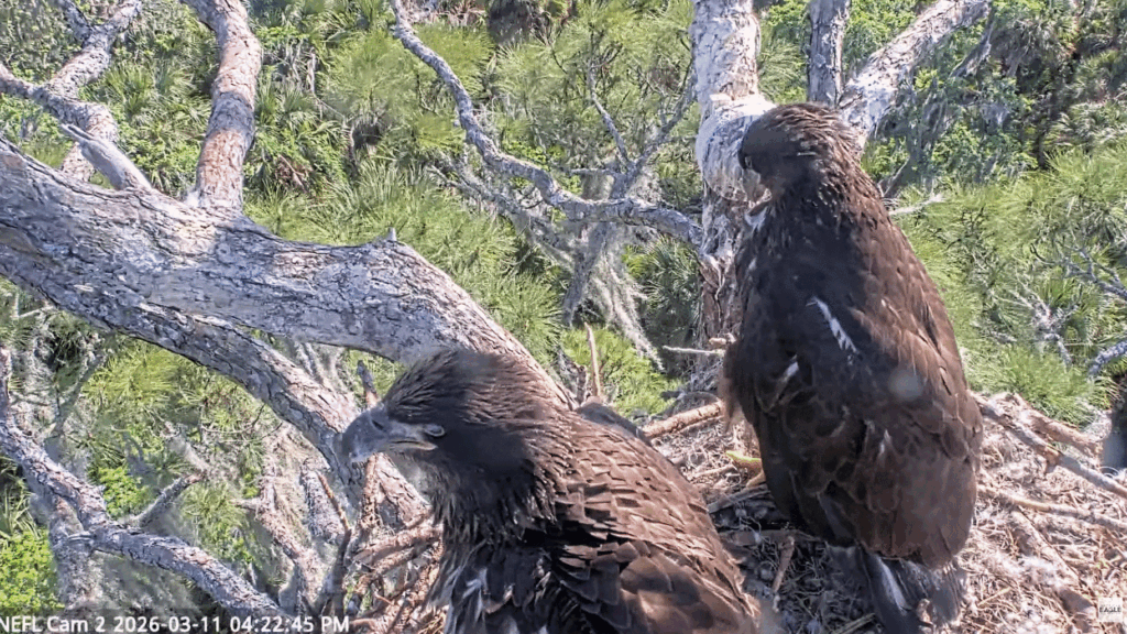 Gabby and Beau’s current season began with their timely returns in August and September 2024. They laid two eggs: NE26 on December 17, 2024, and NE27 on December 20, 2024. The first egg hatched around January 23, 2025, producing eaglet NE31, while the second hatched around January 25, 2025, but that chick didn’t survive. NE31 (Bodie), now about seven weeks old as of March 12, 2025, is thriving. Recent observations (e.g., March 8, 2025) show Gabby delivering a shark to the nest, with NE31 attempting to self-feed—a sign of its growing independence. Beau has been actively involved, bringing prey and sharing incubation duties earlier in the season. Some watchers speculate NE31 might be female due to its size, though this isn’t confirmed.