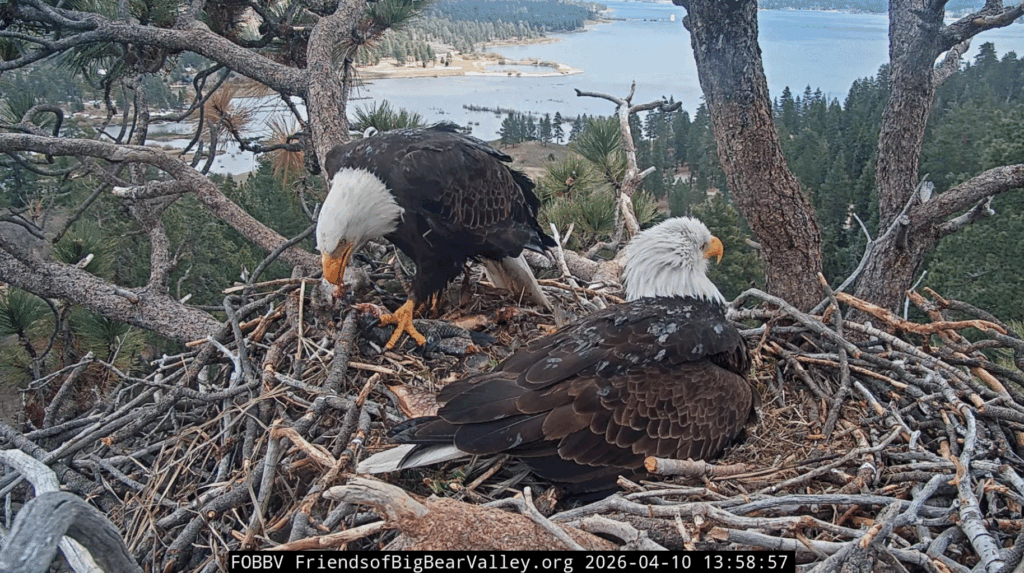 3/31/26 – Pip watch is here! Today is egg 1’s 35th day of incubation, the world watches with anticipation. Egg 2 was laid 3 days after egg 1, so it will be ready in a few days. Shadow is here seen rolling the eggs while he continues his egg duty. The eggs at Big Bear Valley usually hatches after 35-40 days, so we will be watching closely this week for pips on the eggs!