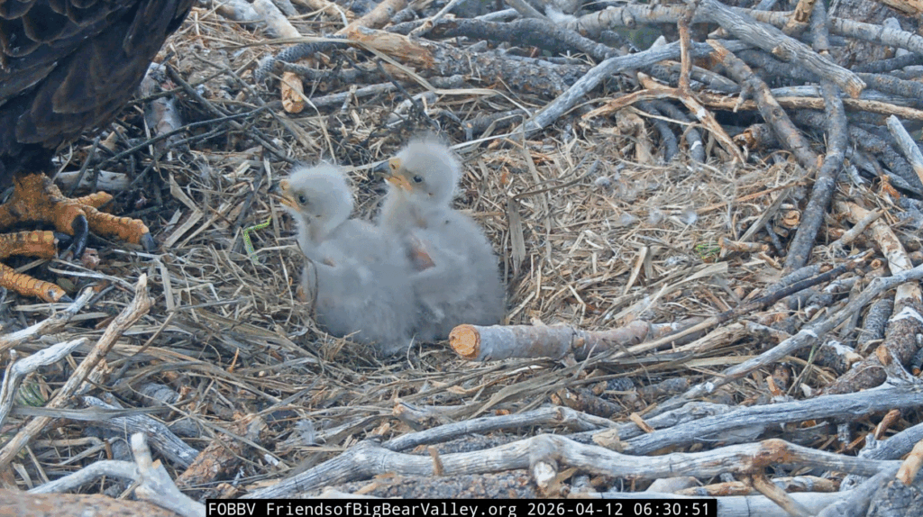 4/13/26 – The sun is shining on this fine Monday morning, and the eagle family is all ok. Jackie gave the eaglets their early breakfast, then Shadow arrived to take over the shift and gave them their 3rd breakfast. The eaglets look healthy, with their crops full. What a great way to start the week. The forecast shows chance of rain later today, we will see what the day brings.