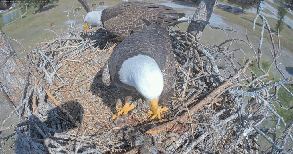 12/21/25 – F23 feeding on a fish while M15 keeps E26 warm.